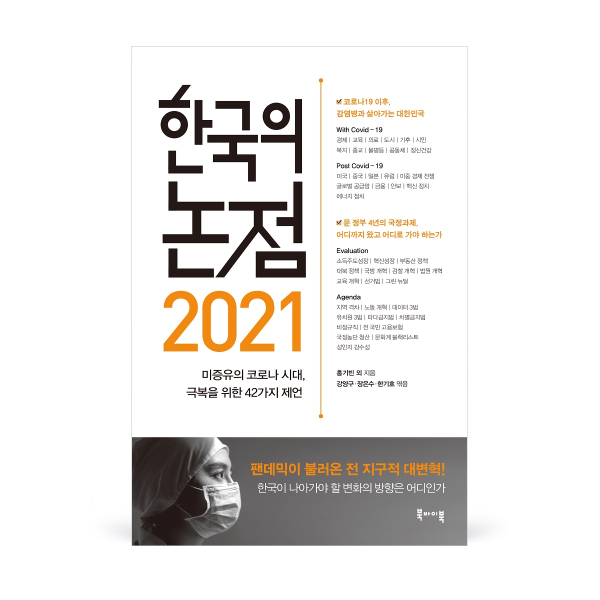 해마다 한국사회의 주요 쟁점들을 분석했던 『한국의 논점』이 올해도 출간되었다. 『2021 한국의 논점』은 첫 화두로 코로나19 팬데믹이라는 재난을 겪으며 버틴 대한민국의 현재와 코로나 이후 재편되는 세계의 모습을 살피고 전망한다. 두 번째 화두로는 재임 4년 차 임기 후반을 맞은 문재인 정부가 직면한 과제와 아직 풀지 못한 현안을 분석한다.