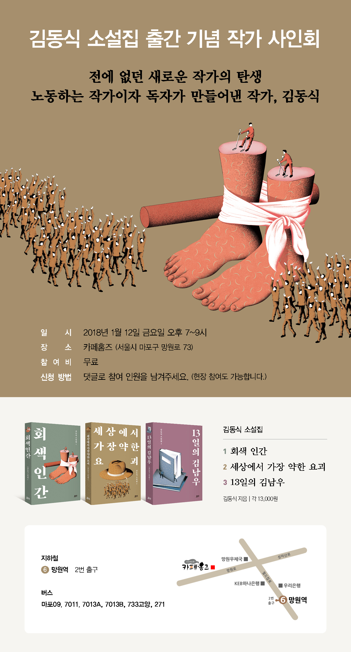 김동식 작가 사인회 Home>Shop All Products>강의신청>김동식 작가 사인회 김동식 작가 사인회 ₩0 일시 : 1월 12일 금요일 오후 7~9시 장소 : 카페홈즈 (서울시 마포구 망원동 73, 2층) 참여비 : 무료 (누구나 참여 가능) Out of stock Product added to wishlist. Product added! Browse Wishlist The product is already in the wishlist! Browse Wishlist Category: 강의신청 Share000 Description Reviews(0) There are no reviews yet. Add a Review Be the first to review “김동식 작가 사인회” 응답 취소댓글을 작성하기 위해서는 로그인해야 합니다. Related products Sold out ₩20,000 Out of stock Product added to wishlist. <출판 마케팅 전략 가이드> 출간 기념 강연회 강의신청 일시 : 2018년 5월 16일(수) 오후 7시 30분~9시 장소 : 한빛미디어 강의실 '리더스홀'(서울 서대문구 연희로2길 62) 참가비 : 20,000원(<출판 마케팅 전략 가이드> 도서 증정) 정원이 40명에서 80명으로 변경되었습니다. ₩20,000 ₩20,000 Out of stock Product added to wishlist. Sold out ₩0 Out of stock Product added to wishlist. <100일 글쓰기 곰사람 프로젝트> 원데이 특강 강의신청 일시 : 2017년 8월 17일(목) 오후 7시 30분~9시 30분 장소 : 한겨레교육문화센터 606호 (서울시 마포구 백범로 18) 수강료 : 무료 ₩0 Rated 1.00 out of 5 ₩0 Out of stock Product added to wishlist. Sold out ₩20,000 Out of stock Product added to wishlist. <콘텐츠 플랫폼 마케팅> 저자 강연회 강의신청 일시 : 2019년 6월 20일(목) 오후 7시 30분 장소 : 한빛미디어 강의실(서울 서대문구 연희로2길 62) 참가비 : 20,000원(<콘텐츠 플랫폼 마케팅> 도서 증정 ₩20,000 ₩20,000 Out of stock Product added to wishlist. Sold out ₩20,000 Out of stock Product added to wishlist. <출판 경영> 원데이 특강 – 원가계산, 손익분기, 원가절감 등 출판 경영 실무 강의신청 일시 : 2017년 7월 12일(수) 오후 7시 30분~9시 30분 장소 : 한국출판마케팅연구소 강의실 (문의 : 02-336-5675) 수강료 : 2만원(교재 <출판 경영> 제공) 인원 : 30명 ₩20,000 ₩20,000 Out of stock Product added to wishlist.